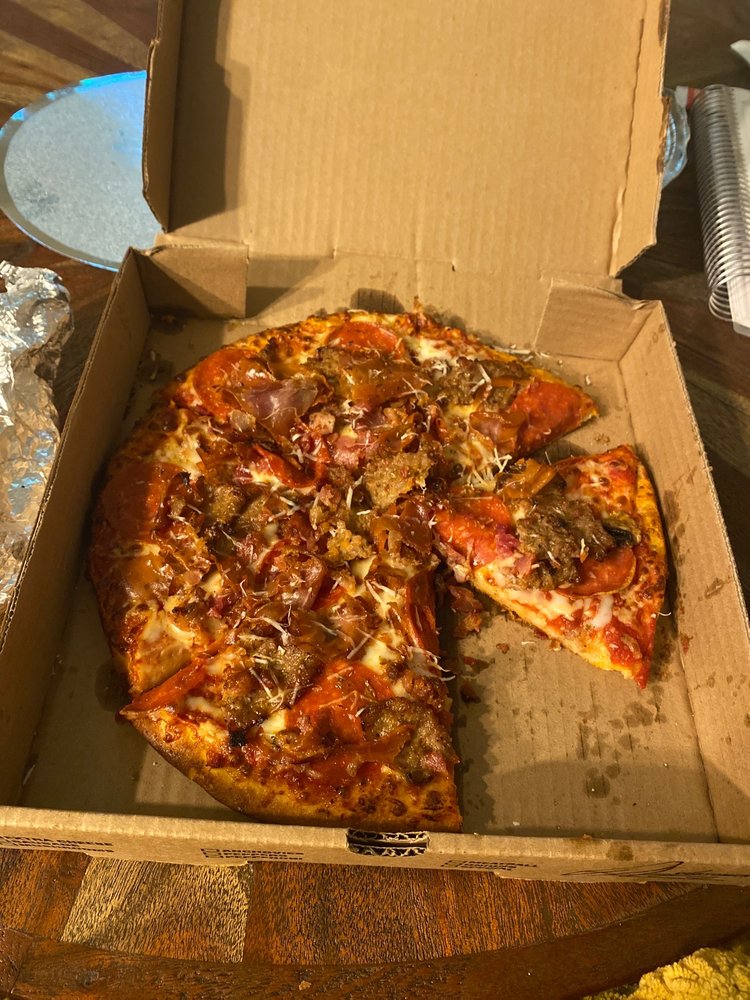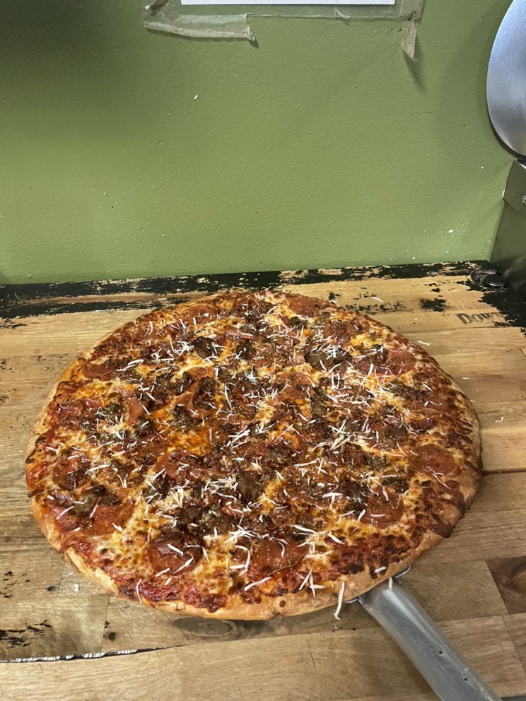 Marinara sauce, mozzarella, pepperoni,home made sausage, roasted pepper, mushrooms, and black olives.
